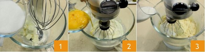 Para preparar a torta de trigo sarraceno e geleia de groselha, certifique-se de retirar a manteiga, os ovos e o leite da geladeira pelo menos duas horas antes de fazer a torta. Na batedeira, bata a manteiga amolecida cortada em cubos e metade do açúcar refinado 1; pegue os ovos em temperatura ambiente, separe as gemas das claras (guarde-as, pois serão usadas posteriormente) e adicione as gemas 2 e o leite aos poucos 3.