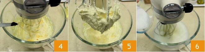 Corte a fava de baunilha no sentido do comprimento e retire as sementes com uma faca, adicionando-as à mistura 4; continue batendo até obter uma mistura clara e espumosa 5. Em uma tigela separada, comece a bater as claras (devem ser batidas até ficarem cremosas) e, quando estiverem brancas, adicione aos poucos a outra metade do açúcar que você reservou 6.