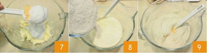 Neste ponto, incorpore as claras batidas à mistura, mexendo delicadamente com uma espátula de cima para baixo para evitar que percam o volume 7. Adicione aos poucos a farinha de trigo sarraceno à massa 8, depois peneire o fermento e mexa com a espátula para evitar a formação de grumos 9.