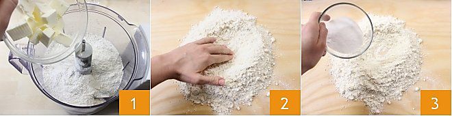 Para preparar a torta de São Brás, comece fazendo a massa podre: bata a manteiga fria com a farinha em um processador até obter uma mistura arenosa 1. Transfira a mistura para uma superfície de trabalho, forme uma fonte clássica 2 e adicione o açúcar 3.