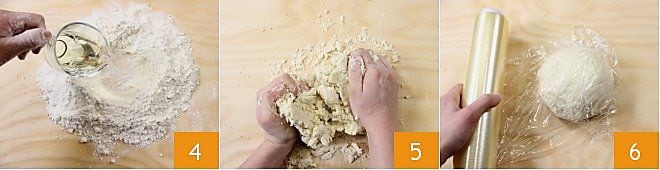 Misture com as mãos e, aos poucos, adicione o vinho branco em fio 4. Adicione as sementes de baunilha e amasse energicamente com as mãos 5 para obter uma massa compacta e bem misturada. Cubra a massa obtida com filme plástico 6 e deixe descansar por 20 minutos na geladeira.