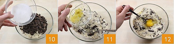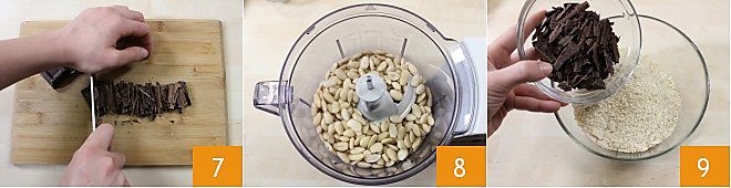 Enquanto isso, pique finamente o chocolate amargo 7 e triture as amêndoas em um processador 8. Em uma tigela grande, misture os dois ingredientes 9 e