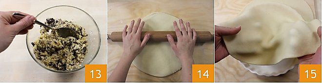Misture bem os ingredientes com uma colher 13. Neste ponto, abra a massa podre com a ajuda de um rolo, até uma espessura de meio cm 14 e cubra com ela uma forma de torta, com 27 cm de diâmetro, bem untada e enfarinhada 15.