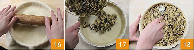 Elimine o excesso de massa, pressionando as bordas da forma com o rolo 16 e recheie a torta com o recheio 17, nivelando bem com uma colher 18.