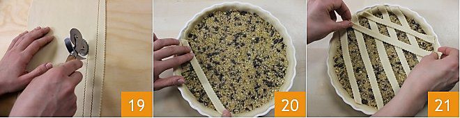 Amasse e abra novamente as sobras de massa e, com uma roda de borda dentada, corte tiras 19, que você colocará na torta primeiro na diagonal 20, de modo que ao se cruzarem formem losangos 21.