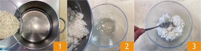 Para preparar a torta doce de arroz e ricota, primeiro coloque em uma panela a água e o arroz 1, acenda o fogo e cozinhe por cerca de 25 minutos, até que tenha absorvido todo o líquido. Uma vez cozido, transfira o arroz para uma tigela 2 e deixe esfriar completamente 3.