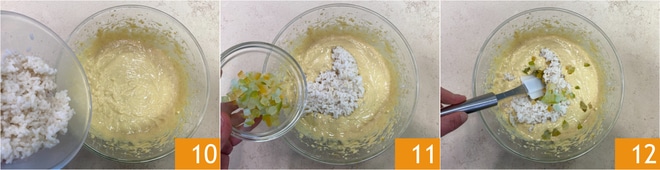 Por fim, adicione o arroz 10 e as frutas cristalizadas 11 e mexa para incorporá-los de maneira uniforme 12.