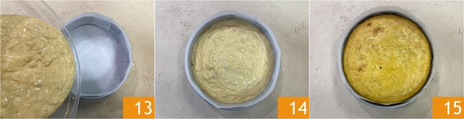 Despeje a mistura em uma forma de 22 cm de diâmetro com fundo removível forrada com papel manteiga 13, certificando-se de que o papel sobressaia da forma em altura porque o bolo tende a crescer no forno. Nivele a superfície 14 e asse em forno estático a 170° por cerca de 80 minutos 15.