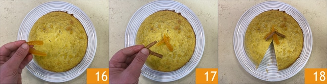 Passado o tempo de cozimento, retire do forno e deixe esfriar, em seguida, desenforme o bolo e decore com laranja cristalizada 16 e paus de canela 17. Sua torta doce de arroz e ricota está pronta para ser servida 18!
