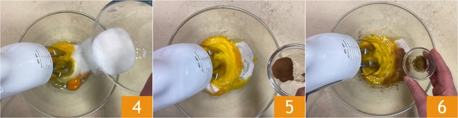 Enquanto isso, coloque em uma tigela os ovos e o açúcar 4, em seguida adicione a canela 5 e o extrato de baunilha 6. Bata até que a mistura mude de cor, não deve ficar excessivamente arejada.