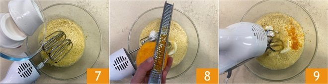 Adicione a ricota 7, a casca de laranja ralada 8, uma pitada de sal e misture novamente com a batedeira 9 até obter uma mistura homogênea.