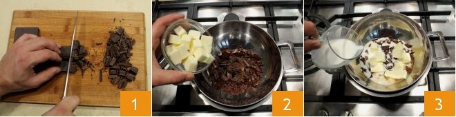 Para realizar o bolo em fatias, primeiro prepare a base: pique o chocolate amargo 1 e derreta em banho-maria junto com a manteiga em pedaços 2. Despeje o leite aos poucos 3 e