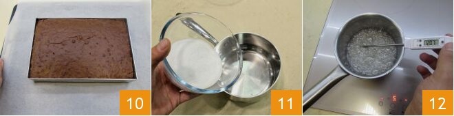 Quando terminar de assar, retire a base do forno 10 e deixe esfriar. Enquanto isso, prepare o creme de manteiga: comece colocando em uma panela com fundo grosso a água e o açúcar 11, aquecendo em fogo baixo e mexendo de vez em quando com uma colher de aço. Quando o açúcar estiver dissolvido, verifique se a temperatura do xarope chega a 121°C 12.