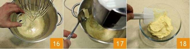 Incorpore então as sementes da fava de baunilha 16 e a manteiga amolecida à temperatura ambiente na batedeira 17, batendo até que o composto fique cremoso. Transfira o creme de manteiga obtido para uma tigela 18.