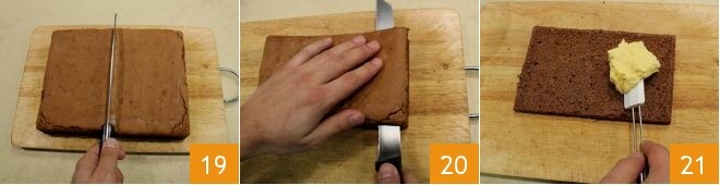 Quando o bolo estiver completamente frio, corte-o ao meio, de modo a obter dois bolos 19, e depois corte-o horizontalmente em 3 partes 20. Recheie a base com uma parte do creme de manteiga com a ajuda de uma espátula 21, depois