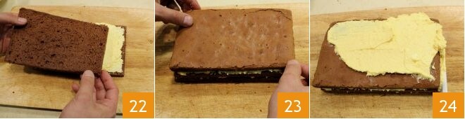 coloque o segundo retângulo 22; recheie também a segunda camada e, por fim, cubra com a última 23. Cubra a superfície e as bordas do bolo com o creme de manteiga, distribuindo de maneira uniforme 24.