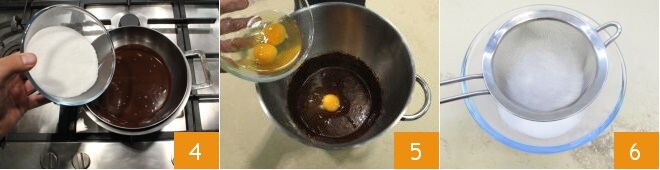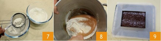 a farinha 7, depois adicione os pós à mistura uma colher de cada vez. Misture de baixo para cima com uma espátula para incorporar a massa 8. Despeje a massa em uma forma retangular de 20x25 cm 9 e asse em forno estático pré-aquecido por 45 minutos a 170 °C (se o forno for ventilado, a 150°C por 35 minutos).