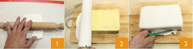 Uma vez recheados os bolos, pegue a pasta de açúcar e estenda-a com a ajuda de um rolo sobre uma superfície de trabalho polvilhada com açúcar de confeiteiro 1. Cubra então os bolos 2, alisando a superfície com um alisador. Com uma faquinha de lâmina lisa, termine as bordas 3