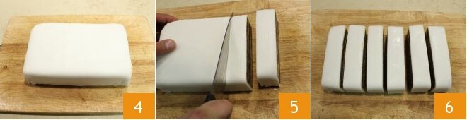 para eliminar as partes em excesso 4, depois corte 6 fatias com espessura de 4,5 cm (5-6). Com as nossas doses, você deverá obter 12 fatias no total