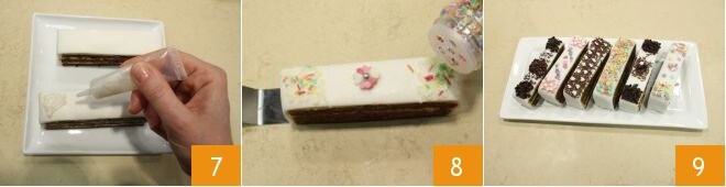 Com a decoração em gel, decore a superfície de cada fatia 7. Agora, pegue as decorações finais de açúcares coloridos e aplique-os em cada fatia, criando motivos decorativos diferentes (8-9).