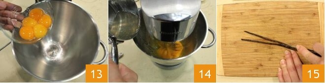 Enquanto isso, coloque as gemas em uma batedeira 13 e comece a batê-las na velocidade máxima; adicione o xarope de açúcar aos poucos 14 e bata até esfriar completamente. Enquanto as gemas montadas estão esfriando, corte uma fava de baunilha no sentido do comprimento e extraia as sementes raspando com uma faquinha 15.