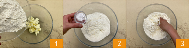 Para preparar a esfarelada com geleia, coloque em uma tigela a manteiga fria em cubos, a farinha 1 e o fermento 2, comece a esfarelar a mistura com as mãos 3.