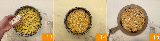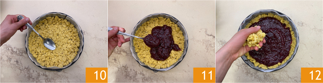 Compacte o fundo com as mãos ou com as costas de uma colher 10 e forme também a borda. Distribua a geleia 11 e cubra com as migalhas restantes 12.