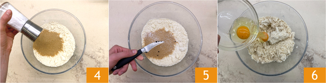 Adicione o açúcar, uma pitada de sal 4 e as sementes de baunilha 5. Por fim, incorpore os ovos 6.