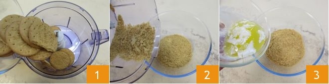 Para preparar o bolo gelado de damascos, comece pela base do bolo. Derreta a manteiga e deixe esfriar um pouco. Triture em um mixer os biscoitos secos 1 até esfarelá-los finamente 2. Em seguida, transfira-os para uma tigela na qual você adicionará a manteiga 3 aos poucos,