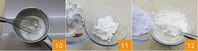 Derreta a gelatina completamente com a ajuda de um batedor manual 10. Deixe esfriar um pouco e, enquanto isso, continue com a preparação do creme de iogurte e mascarpone. Em uma tigela grande, misture o iogurte e o mascarpone 11. Incorpore os ingredientes com a ajuda do batedor e, aos poucos, acrescente também o açúcar de confeiteiro 12.