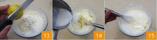 Rale a casca de um limão não tratado 13 e junte a mistura de leite e gelatina já morna 14. Misture para uniformizar os ingredientes 15.