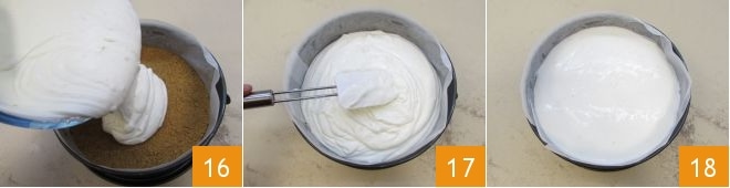 Em seguida, retire a forma da geladeira e despeje nela o creme de iogurte e mascarpone 16. Nivele com uma espátula 17 e coloque na geladeira para endurecer por pelo menos 4 horas 18.