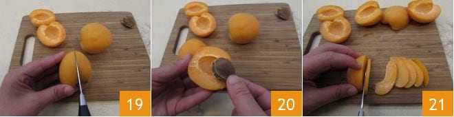 Agora dedique-se à decoração. Lave os damascos, seque-os e corte-os ao meio 19. Remova o caroço 20 e corte cada metade em fatias finas 21.