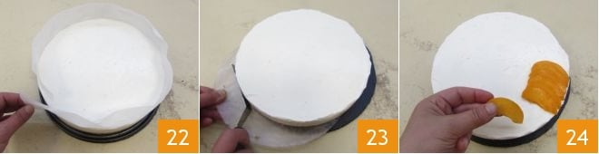 Após 2 horas, retire o bolo da geladeira verificando se o creme compactou e desenforme. Retire delicadamente o anel da forma removível e retire o papel manteiga das bordas do bolo 22. Para remover o papel do fundo, use duas espátulas planas e longas para inserir entre o fundo e o próprio papel e transfira o bolo para um prato de servir. Nivele, se necessário, as bordas laterais do bolo 23. Em seguida, comece a dispor as fatias de damasco 24.