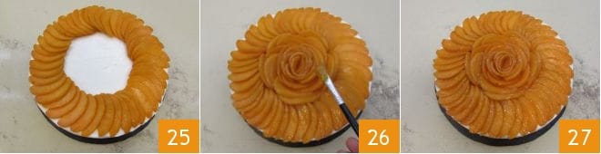 Disponha-as criando um desenho em espiral a partir das bordas do bolo 25 até cobrir também sua parte interna. Você pode dispor os damascos formando um motivo de rosa no centro. Finalmente, pegue a geleia de damasco e, com a ajuda de um pincel, espalhe uniformemente sobre a superfície do bolo 26, cobrindo os eventuais espaços entre as frutas. Agora, o doce está pronto e só resta saborear seu bolo gelado de damascos 27!