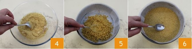 enquanto mistura os ingredientes com uma colher para incorporá-los e obter uma mistura arenosa 4. Em seguida, pegue uma forma de 24 cm de diâmetro, unte-a e forre-a com papel manteiga. Despeje a mistura de biscoito e manteiga 5 e nivele-a para cobrir uniformemente toda a base, ajudando-se com as costas de uma colher 6. Coloque na geladeira para firmar por pelo menos 30 minutos.