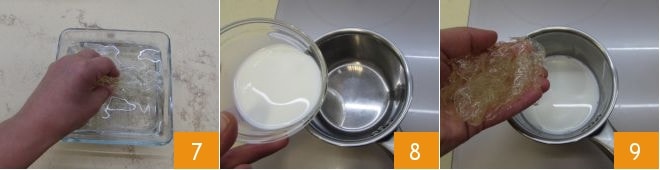 Enquanto isso, prepare o creme. Coloque as folhas de gelatina de molho em uma tigela com água fria 7. Deixe amolecer por pelo menos 10 minutos. Em seguida, pegue uma panela onde você vai despejar o leite 8. Aqueça até quase ferver e desligue o fogo. Em seguida, pegue a gelatina amolecida, escorra e esprema bem e adicione ao leite 9.