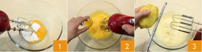 Para preparar o bolo no pote, comece pela massa amanteigada de limão. Separe as gemas das claras e bata-as com uma batedeira elétrica com 45 g de açúcar 1. Adicione o mel 2 e continue até que fiquem claras e espumosas, e aromatize com a casca de limão 3.