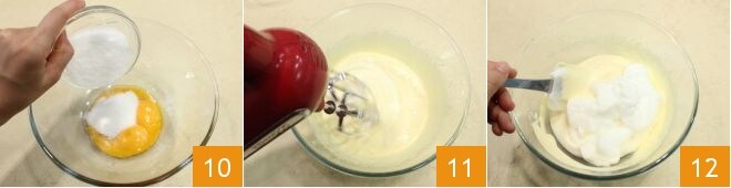 e metade do açúcar 10. Bata as gemas até ficarem claras e espumosas 11. Bata também as claras em neve não muito firme com o restante do açúcar e, em seguida, combine as duas misturas com uma espátula sem desmontá-las 12.