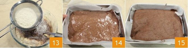 Adicione delicadamente a farinha peneirada junto com o cacau em pó 13 e misture a massa. Espalhe em uma assadeira de 36x27cm forrada com papel manteiga 14. Asse em forno estático pré-aquecido a 190ºC por 5 minutos. Retire a massa amanteigada do forno 15 e deixe esfriar.