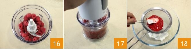 Enquanto isso, prepare o creme: bata no liquidificador as framboesas (16-17), peneire o molho obtido para remover as sementes e coloque-o em uma tigela com o iogurte 18,