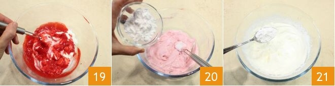 misture com um batedor para combinar os ingredientes 19 e depois adicione metade do açúcar de confeiteiro 20. À parte, bata o creme de leite fresco e adicione a outra metade do açúcar de confeiteiro 21.
