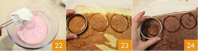 Incorpore o creme batido ao creme de framboesas e misture delicadamente 22. Em seguida, pegue um cortador de 7 cm de diâmetro e corte 4 discos da massa amanteigada de limão 23 e 8 da de chocolate 24.