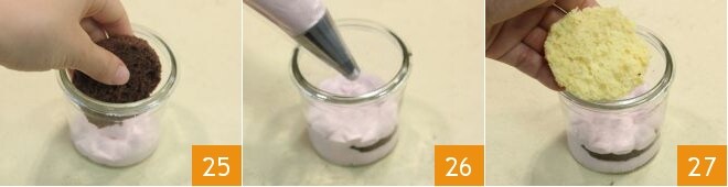 Para montar o bolo, pegue potes de vidro com capacidade de 200 ml: transfira o creme para um saco de confeitar com bico liso e faça uma camada de creme, depois coloque um disco de cacau por cima 25, depois novamente uma camada de creme 26 e sobreponha outro disco de massa amanteigada de limão 27,