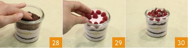 continue com outra camada de creme, um disco de biscoito de cacau 28 e termine com o creme, tomando cuidado para deixar 1 cm da borda. Decore com framboesas frescas 29 e raspas de chocolate amargo 30. Seu bolo no pote está pronto para ser saboreado!