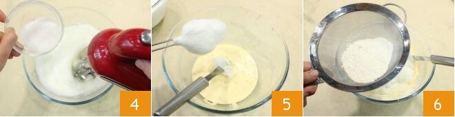 Bata as claras em neve não muito firme junto com o açúcar restante 4, para que não se formem grumos quando você as combinar com outros ingredientes, então combine as duas misturas com uma espátula sem desmontá-las 5. Adicione a farinha peneirada 6 e misture na massa.