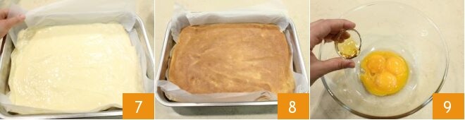 Espalhe a mistura em uma assadeira de 36x27cm forrada com papel manteiga e nivele com uma espátula lisa e plana 7. Asse em forno estático pré-aquecido a 190ºC por 5 minutos; a superfície do doce deve ficar levemente dourada e você não deve abrir o forno (que reterá a umidade) durante o cozimento. Em seguida, retire a massa amanteigada do forno 8 e deixe esfriar. Enquanto isso, prepare a massa amanteigada de chocolate: separe as gemas das claras 1 e bata as gemas junto com o mel 9
