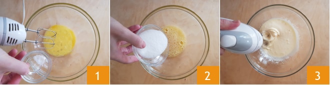 Como primeiro passo, prepare a base da torta macia. Coloque o ovo em uma tigela e incorpore a pitada de sal 1 e o açúcar 2 enquanto bate com as batedeiras elétricas. Continue até que a mistura esteja bem montada 3.