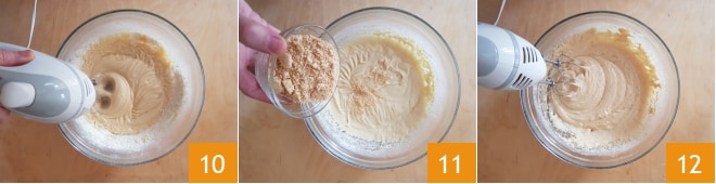 Misture bem tudo, ligando as batedeiras elétricas em baixa velocidade 10, e adicione em várias etapas a farinha de avelã 11, continuando a trabalhar com a batedeira para incorporá-la 12.