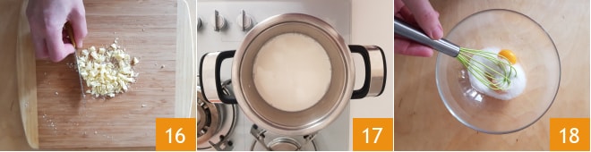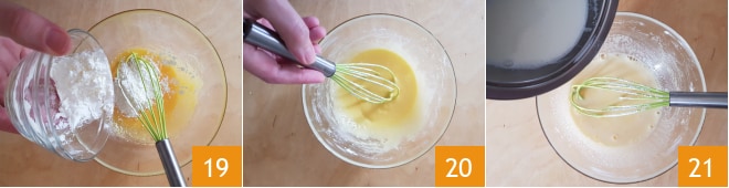 Adicione também o amido de milho 19 e misture 20. Despeje metade do leite quente na mistura de ovos 21. Misture bem com um batedor para evitar grumos e adicione o leite restante.